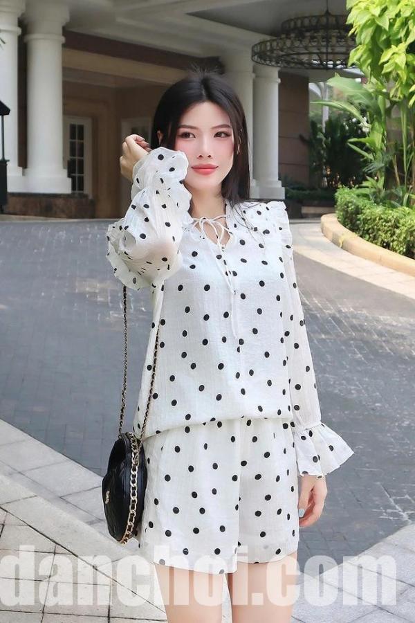 Dành cho những cô nàng không ngại nổi bật và luôn muốn khẳng định dấu ấn cá nhân, diện nguyên một set đồ chấm bi chính là tuyên ngôn thời trang mạnh mẽ nhất. Sự đối lập kinh điển giữa hai gam màu đen trắng luôn tạo ra một hiệu ứng thị giác bùng nổ, thu hút mọi sự chú ý. Một chiếc áo tay phồng điệu đà kết hợp cùng quần shorts đồng bộ không chỉ giúp nàng trông cao ráo, thanh thoát hơn mà còn là tuyệt chiêu cho những ngày "không biết mặc gì" nhưng vẫn muốn mình phải thật đặc biệt. Đừng sợ bị rối mắt, chính sự đồng điệu này sẽ tạo nên một tổng thể hài hòa và cực kỳ thời thượng.