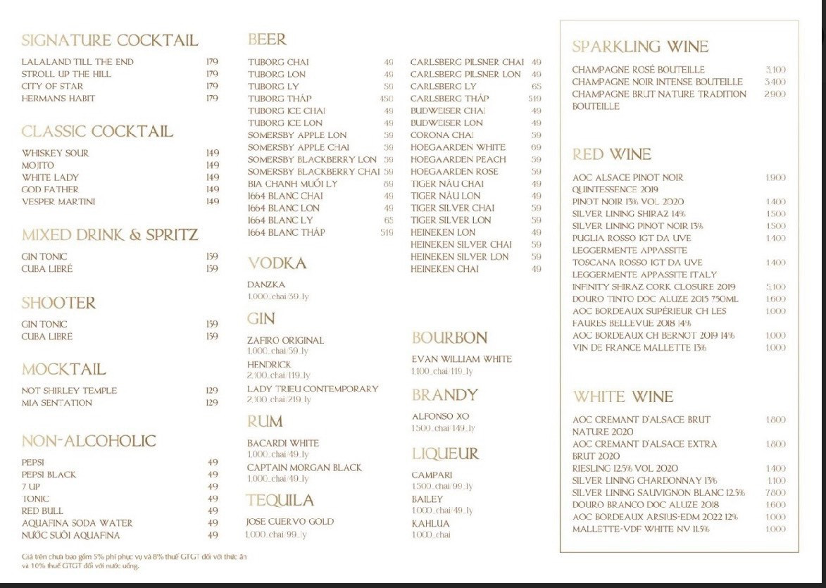 - Đặc biệt: Các món signature phải thử là sườn nướng sốt BBQ, salad Địa Trung Hải, và cocktail Lalaland độc quyền – bảo đảm ghi điểm với mọi thực khách.